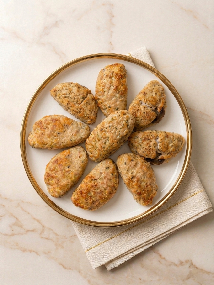 כיסונים עדינים מחזה עוף טחון, במילוי עשיר של פטריות ובצל . המרקם יוצא רך בפנים ופריך בחוץ.